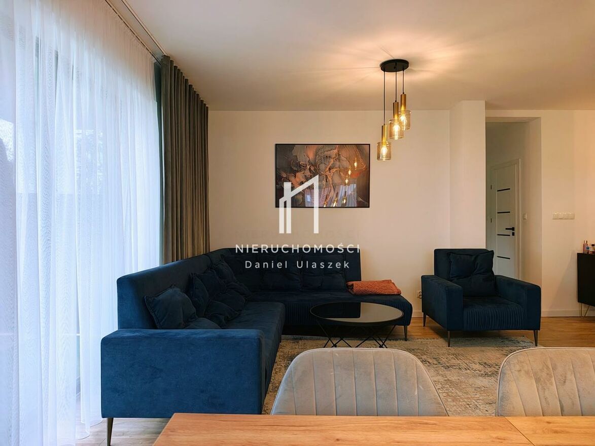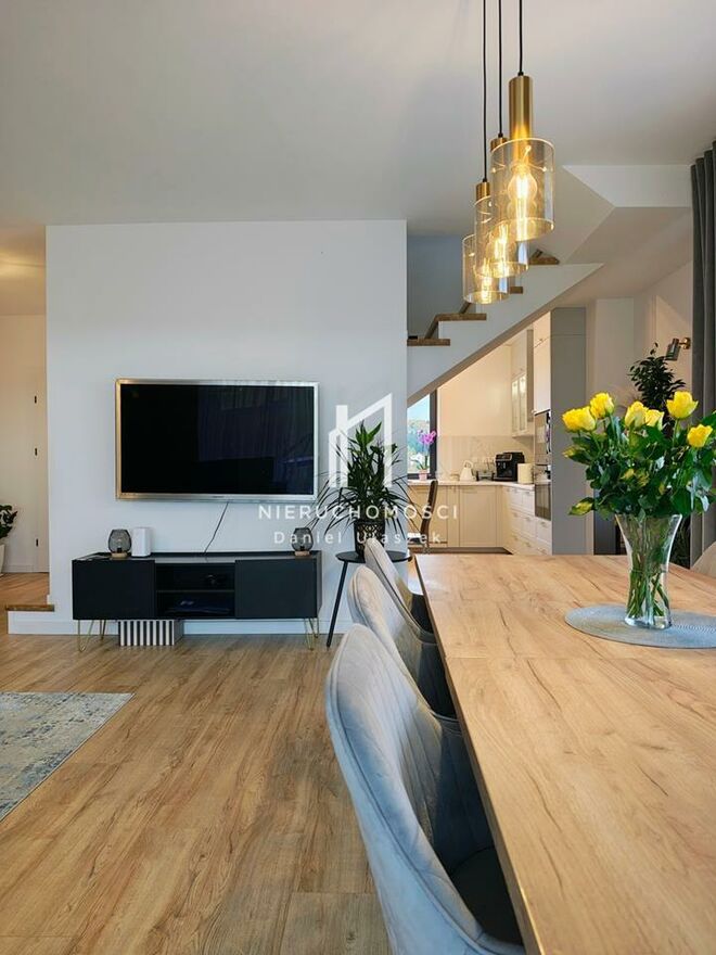 Dom wykończony został w przytulnym klimacie łączącym skandynawską prostotę form z nowoczesnym designem. Znajdziemy tu mnóstwo drewnianych akcentów w stylu skandynawskim, z nutą stylu elektycznego cechującego się kreatywnymi łączeniami wzorów i tekstur, takich jak choćby piękna, wygodna welurowa kanapa narożna w kolorze niebieskim czy mocny akcent z kolorowych wzorów na ścianie w łazience.